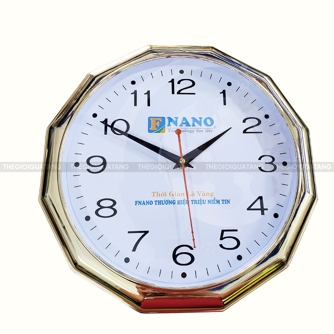 Nâng tầm đẳng cấp không gian với mẫu Đồng hồ treo tường đa giác khắc logo – một tuyệt phẩm hòa quyện giữa ngôn ngữ hình học mạnh mẽ và sắc thái quý tộc. Điểm nhấn đắt giá nhất nằm ở bộ khung đa giác góc cạnh được chế tác từ nhựa PP cao cấp, phủ lớp mạ xi vàng rực rỡ, tạo nên hiệu ứng ánh kim lôi cuốn và sang trọng. Sự kết hợp giữa những đường nét dứt khoát và mặt số trắng tinh khôi không chỉ tạo chiều sâu cho thị giác mà còn biểu trưng cho sự kiên định và thịnh vượng của doanh nghiệp.